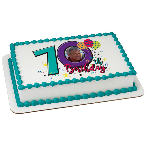 Celebrate a 70th birthday with this simple yet classy edible sugar photo frame that can be personalized to frame your favorite picture on top of your selected cake.