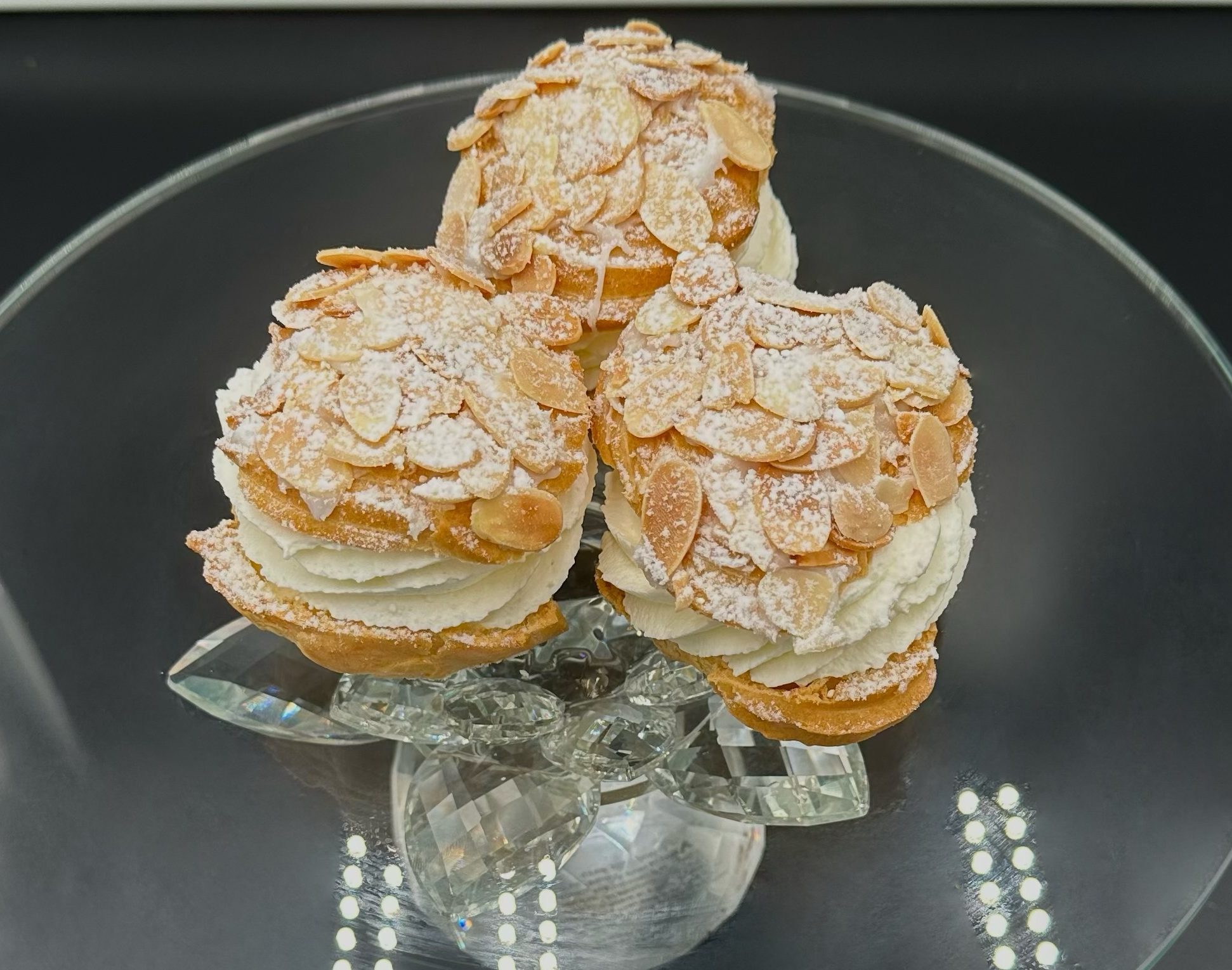 A delicious choux pastry, dipped in icing and topped with sliced almonds, filled with real whipped cream and dusted with icing sugar