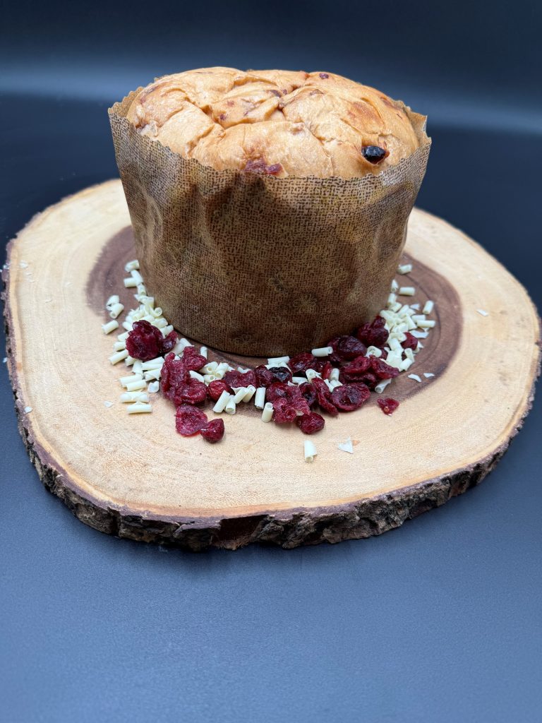 A beautiful homemade panettone with premium Belgian white chocolate and cranberries