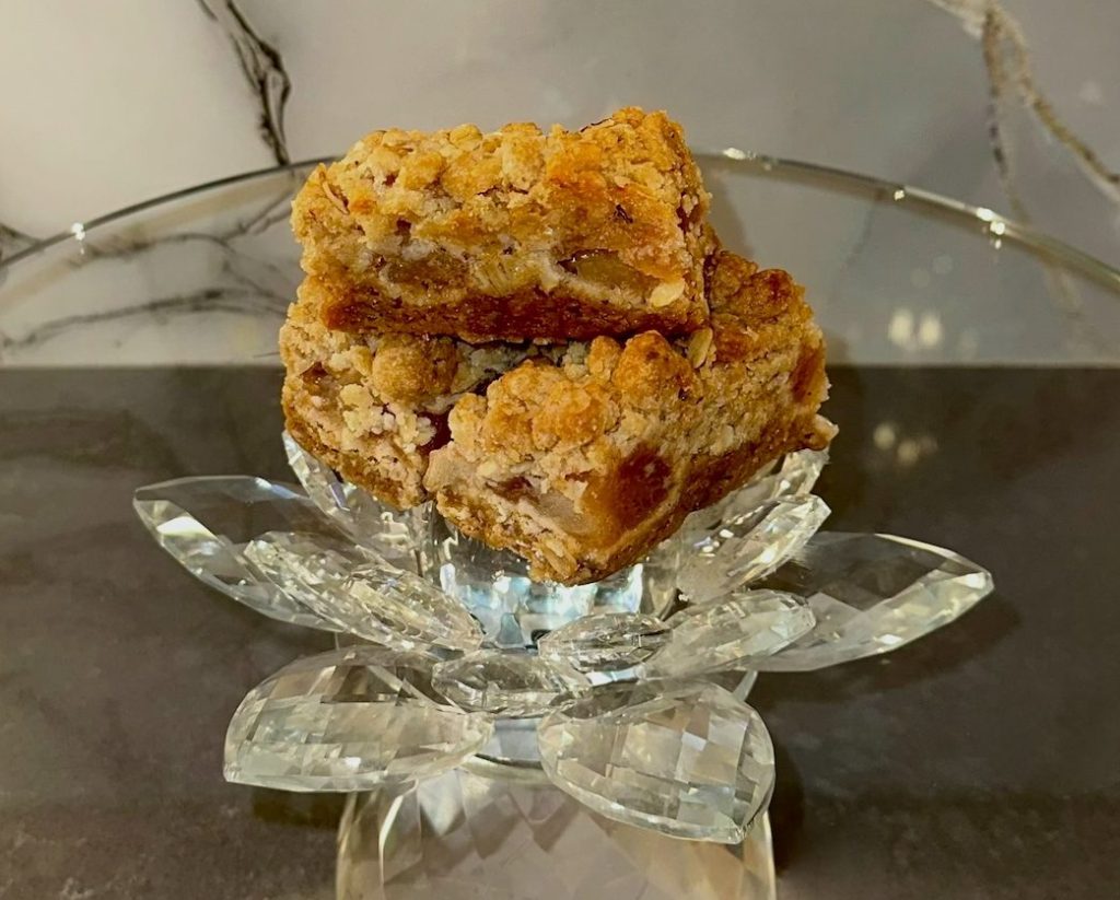 Loads of crisp apples, cinnamon, nutmeg and other spices grace the tasty oatmeal cookie-like crust and is covered with a crunchy golden oatmeal and coconut topping