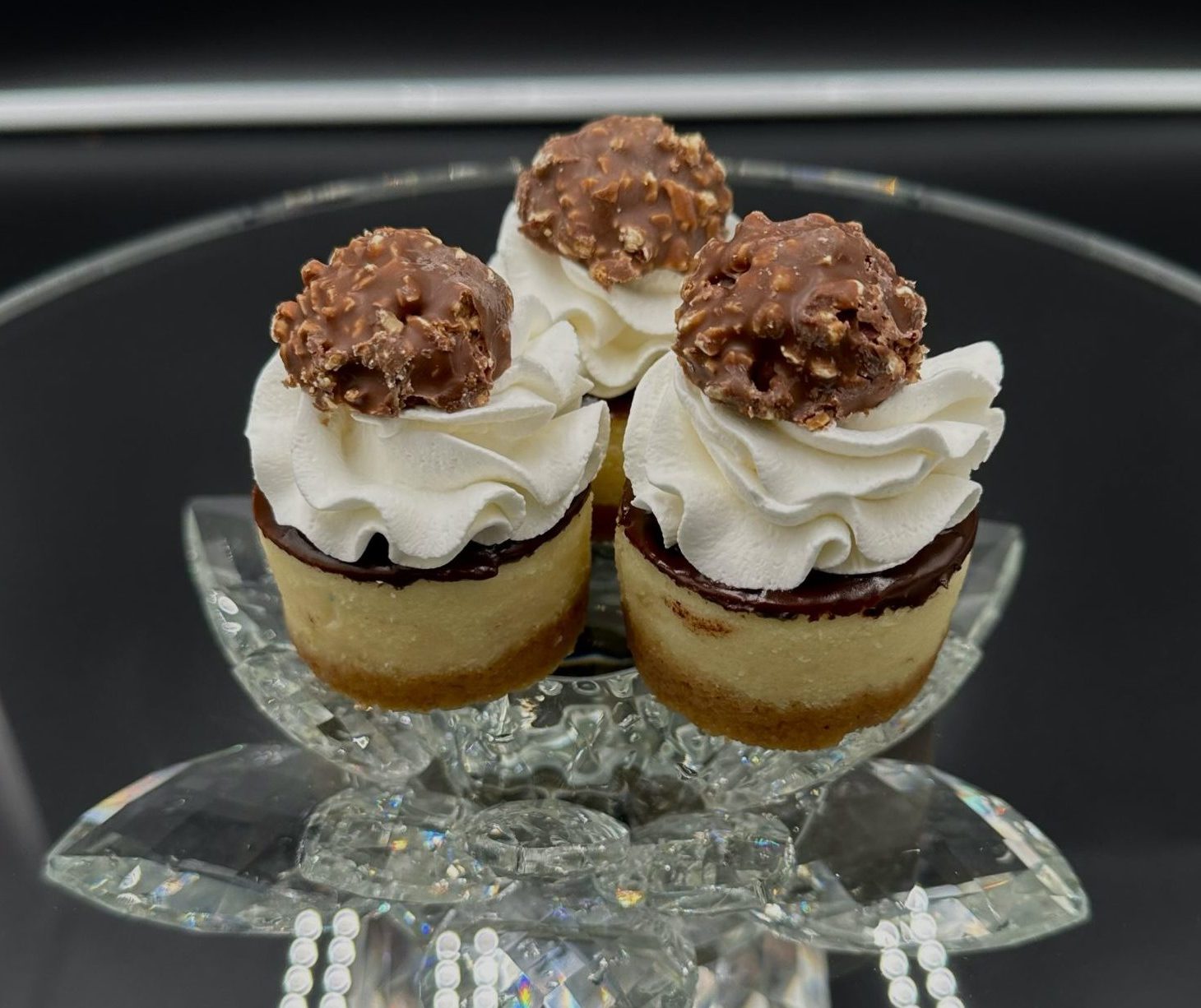 Creamy New York cheesecake topped with chocolate ganache, real whipped cream and half a Ferrero Rocher