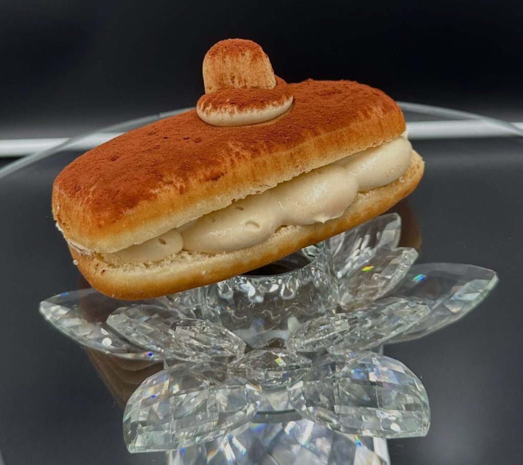 A fluffy doughnut filled with tiramisu cream, dusted with cocoa powder and topped with a lady finger