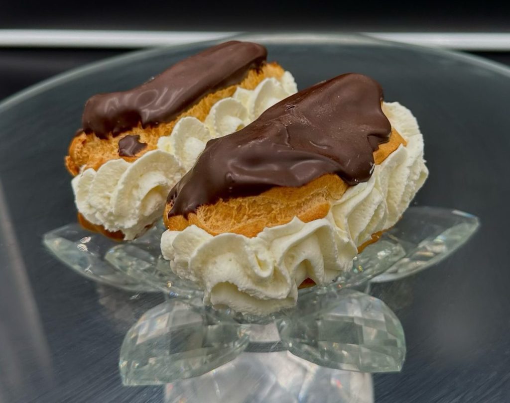 A delicious choux pastry, dipped in chocolate and filled with real whipped cream
