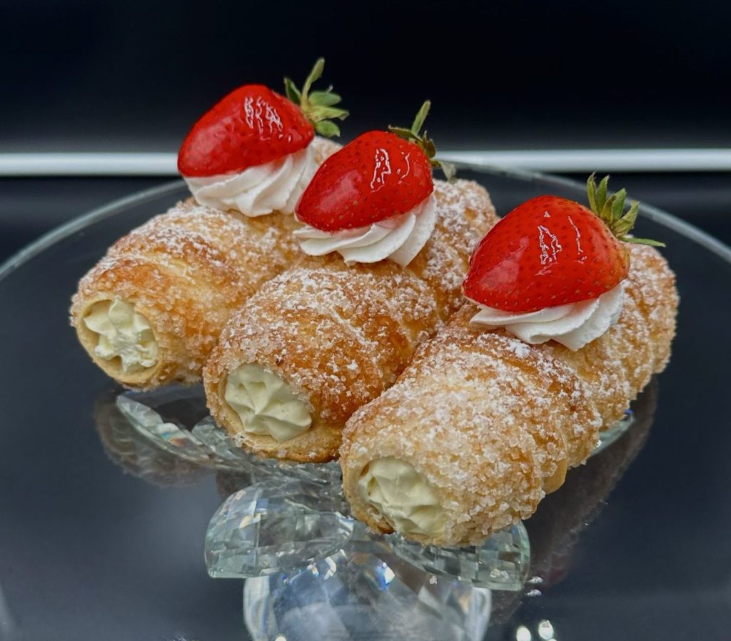 A flaky shell, filled with vanilla custard, dusted with icing sugar and topped with with cream and a strawberry