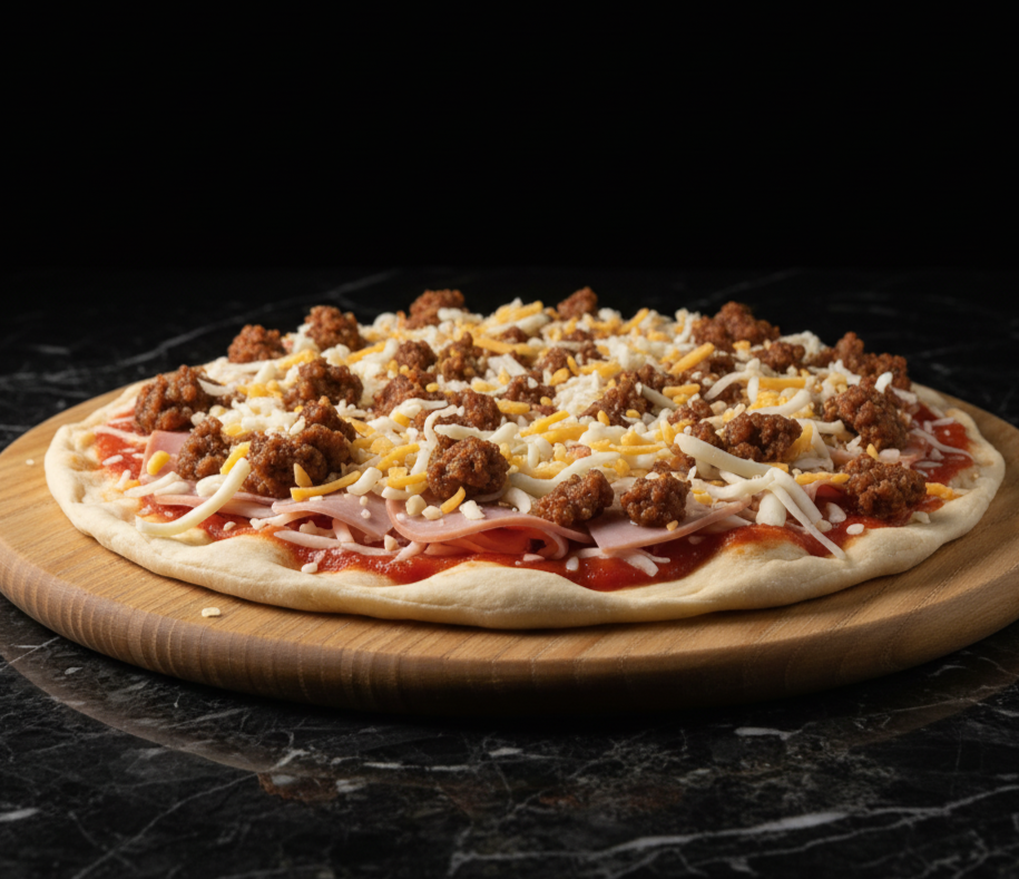 Meat lovers pizza (pepperoni, ham, and ground beef) with a white crust