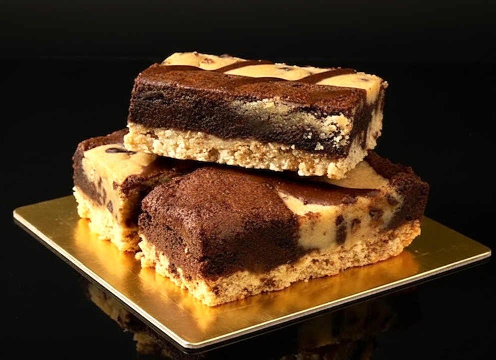 A fusion of moist dark fudge and golden brownies, loaded up with chocolate chip morsels on a chewy, toasted coconut crust and is topped with milk chocolate