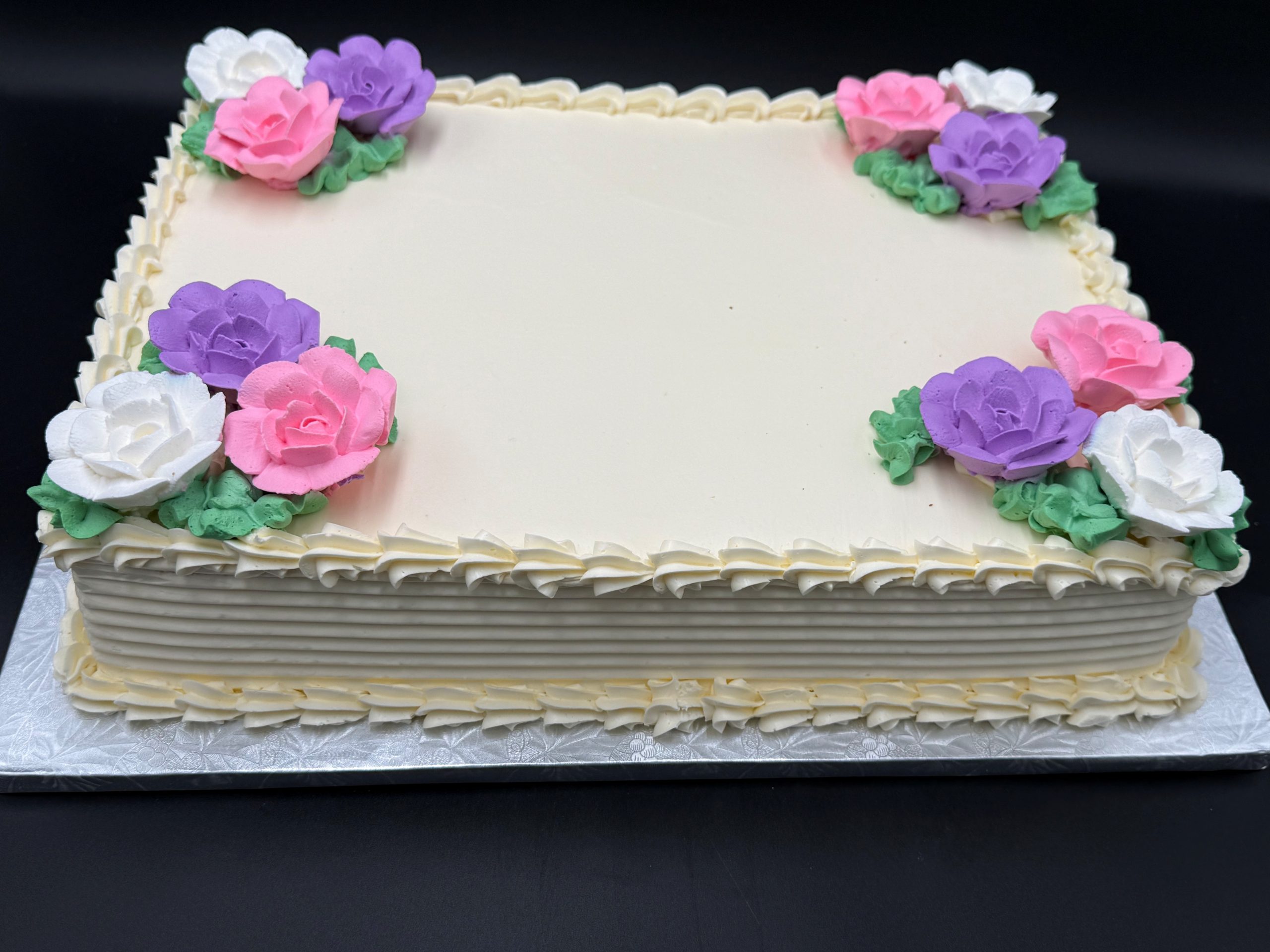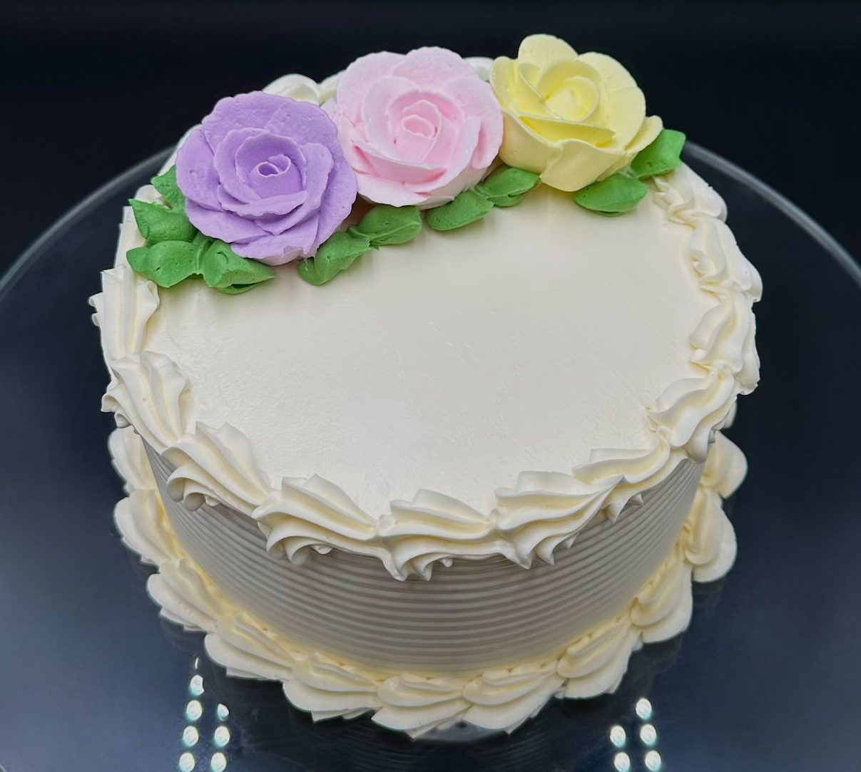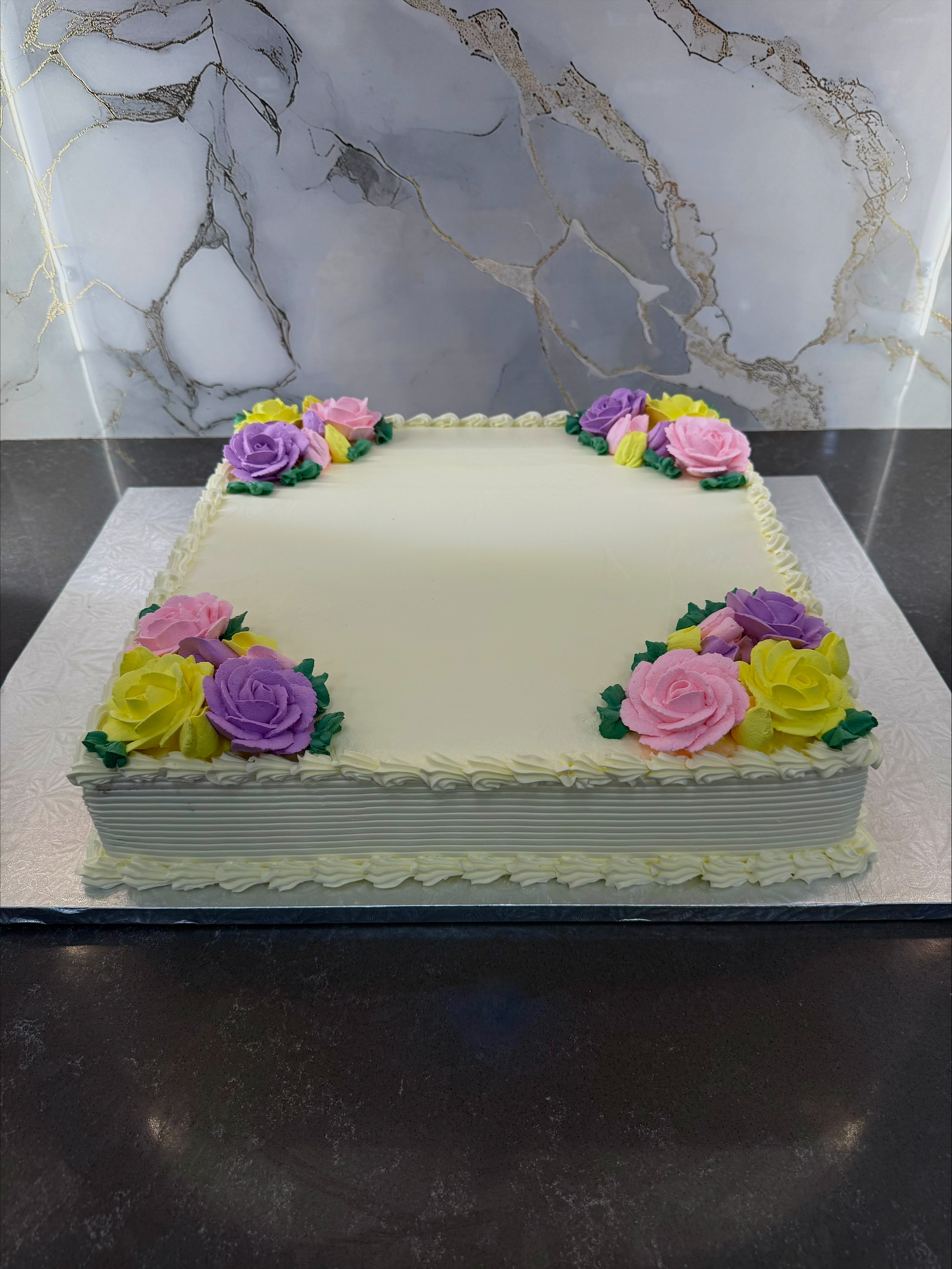 Three layers of vanilla sponge, two layers of buttercream filling, finished with buttercream icing and your choice of coloured flowers